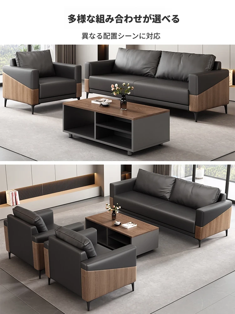 ビジネス接待に最適!シンプルでスタイリッシュな本革オフィスソファとテーブルセット。リラックスできる洽談スペースにぴったりのデザインで、快適な休息を提供します。会議や打ち合わせにも最適です!