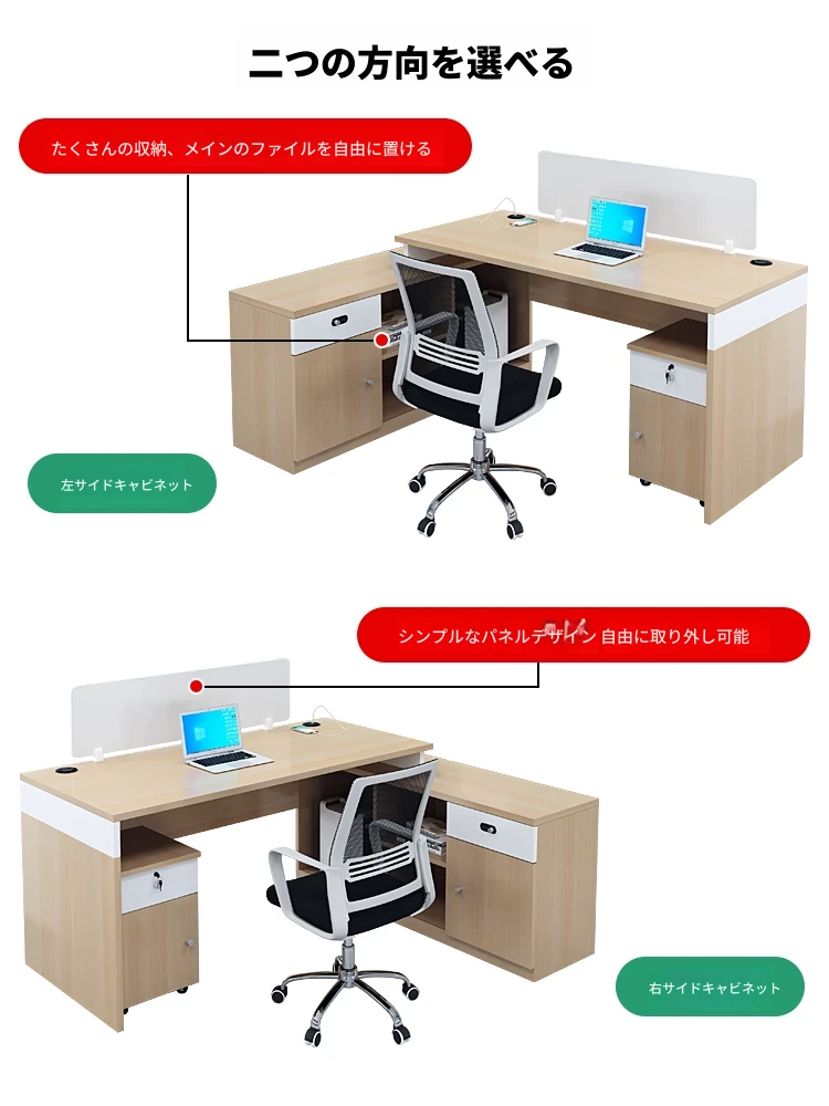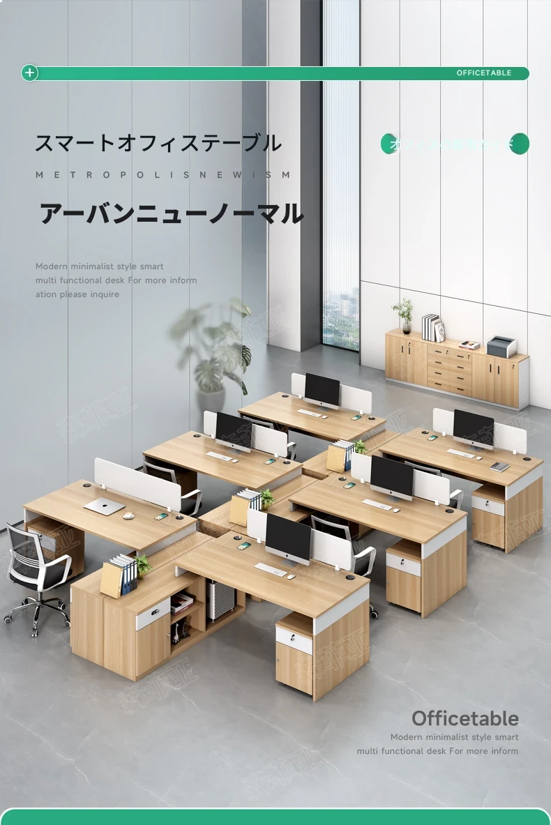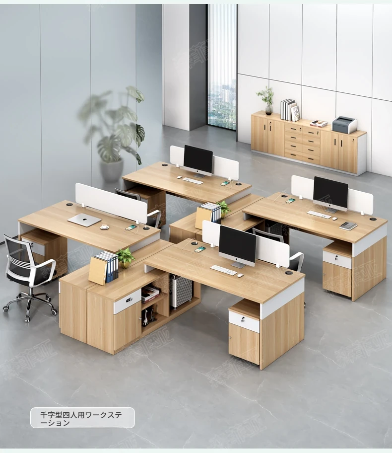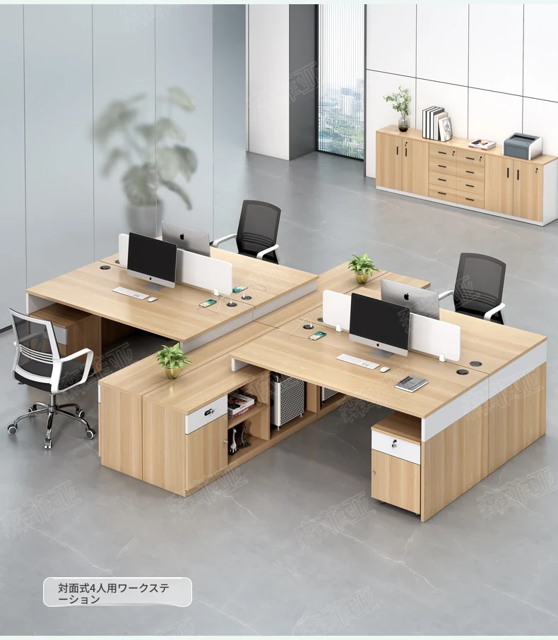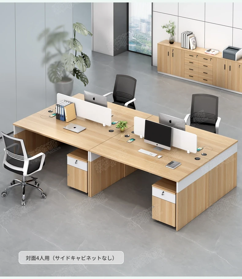 シンプルで機能的なオフィスデスクセット!4人用の社員デスクとチェアのコンビネーション。快適な作業空間を提供し、生産性を向上させる理想的なオフィス環境を実現します。