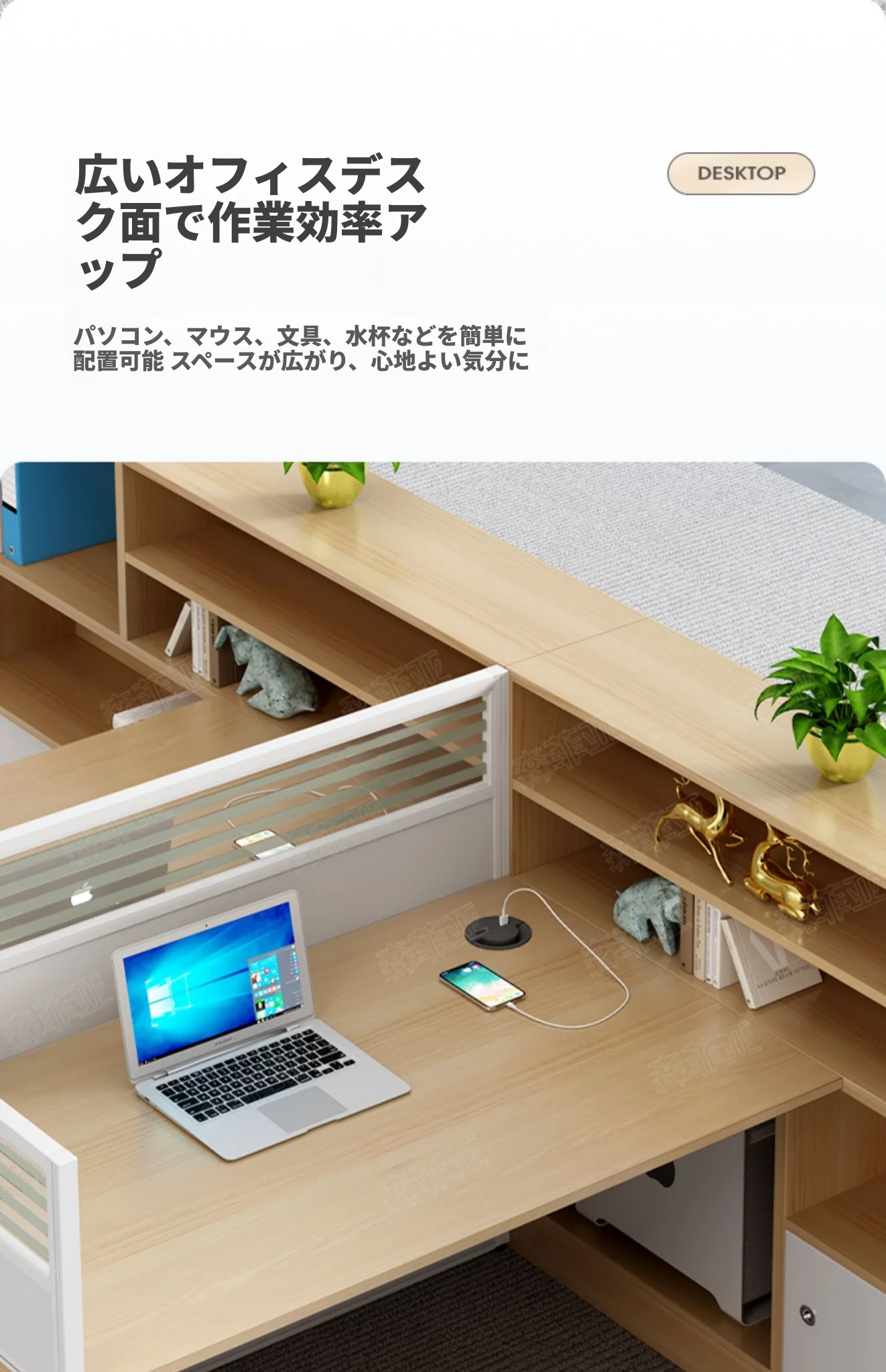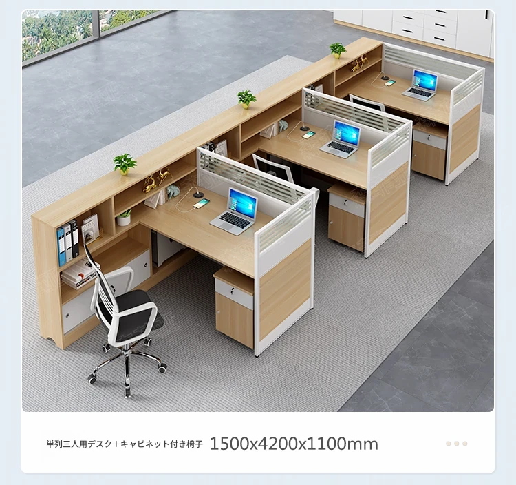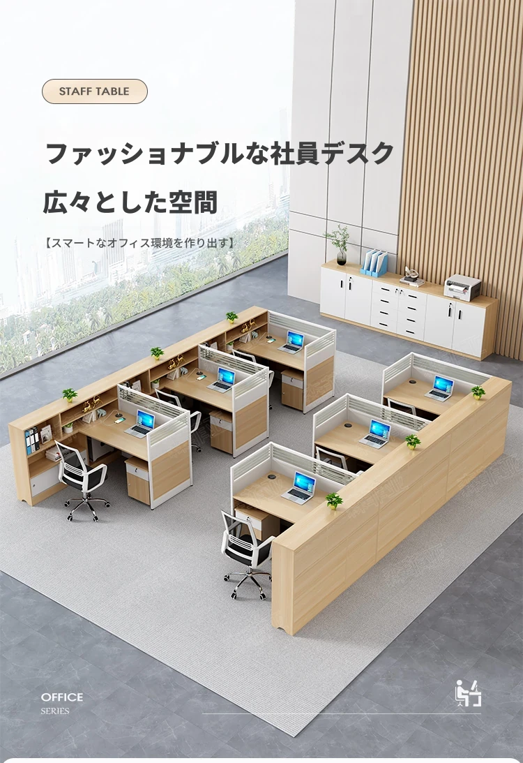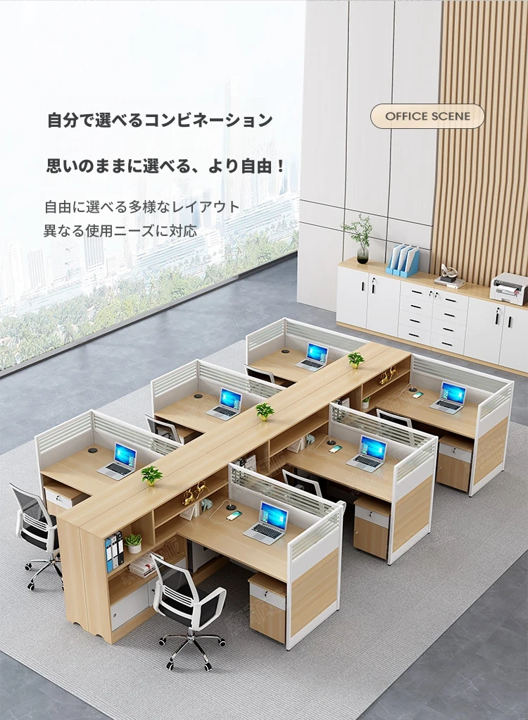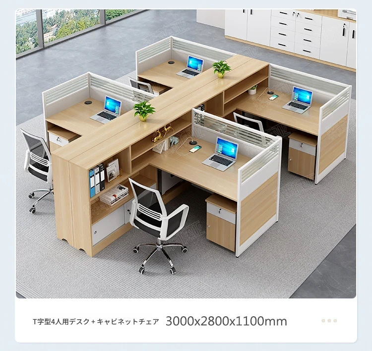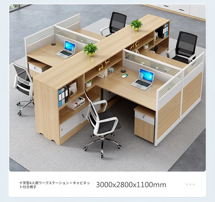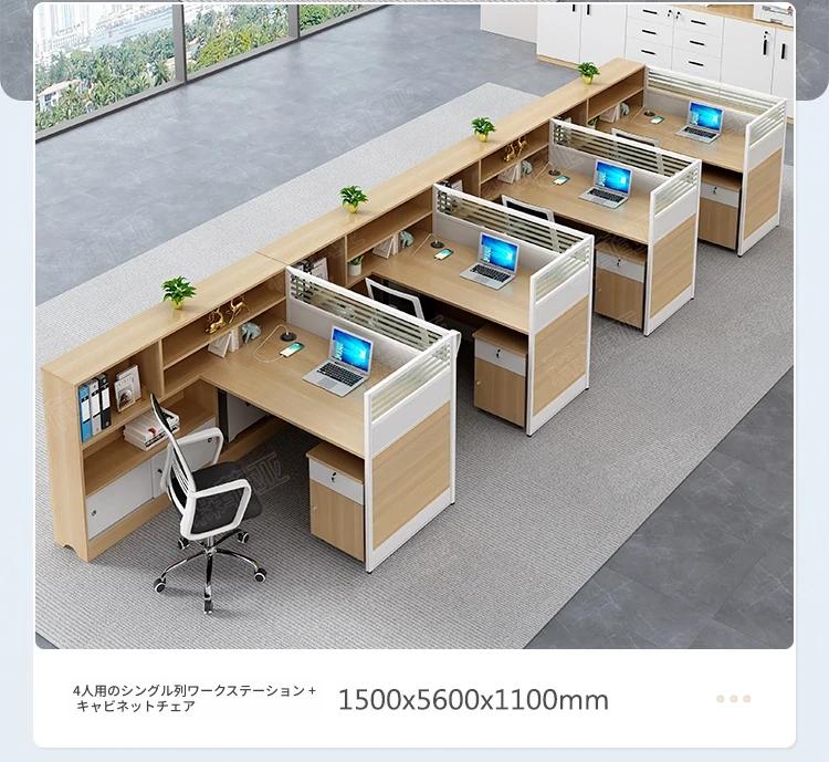 シンプルでモダンなオフィスデスク&チェアセット|4人用パーティション付きオフィスカウンター|快適な職場環境を実現するスタイリッシュなワークスペース家具!