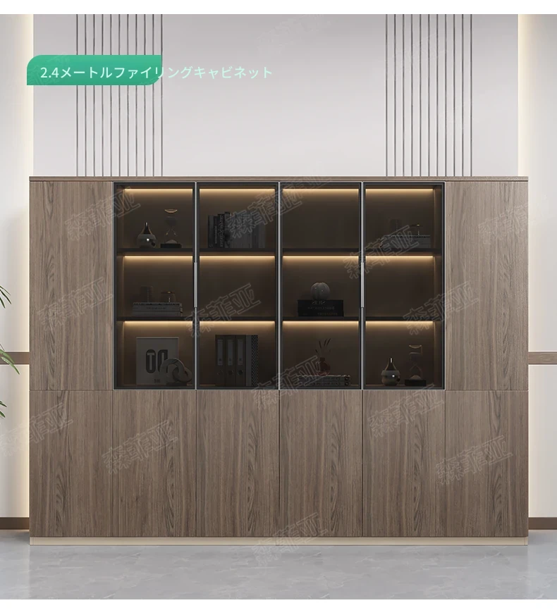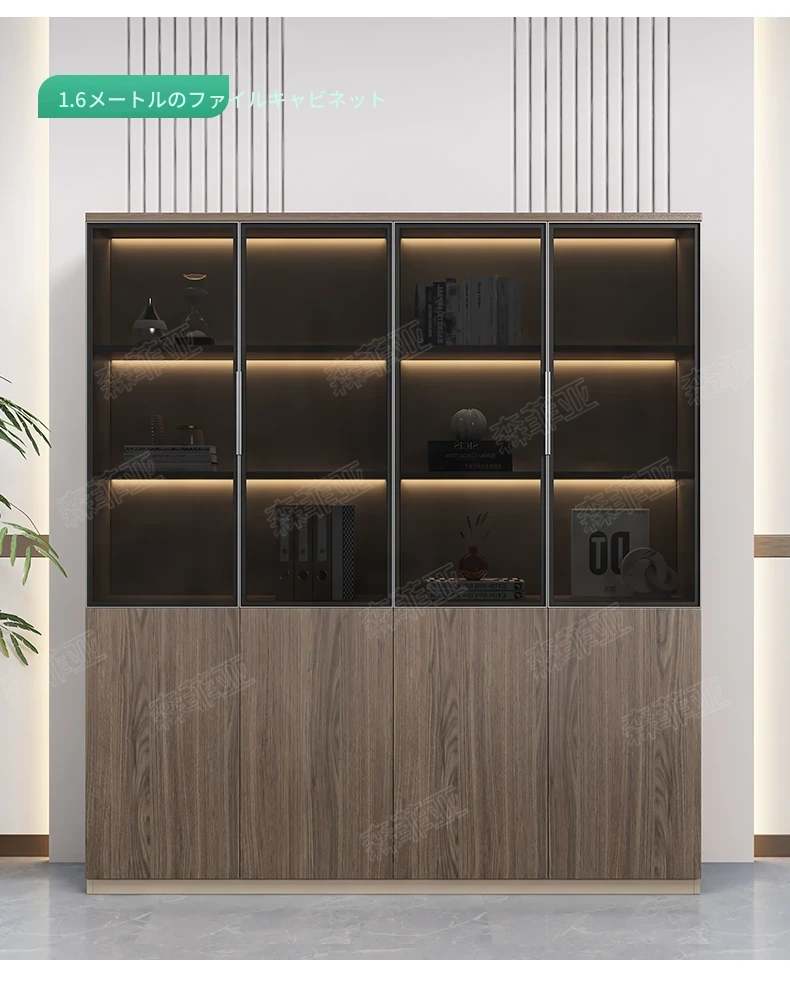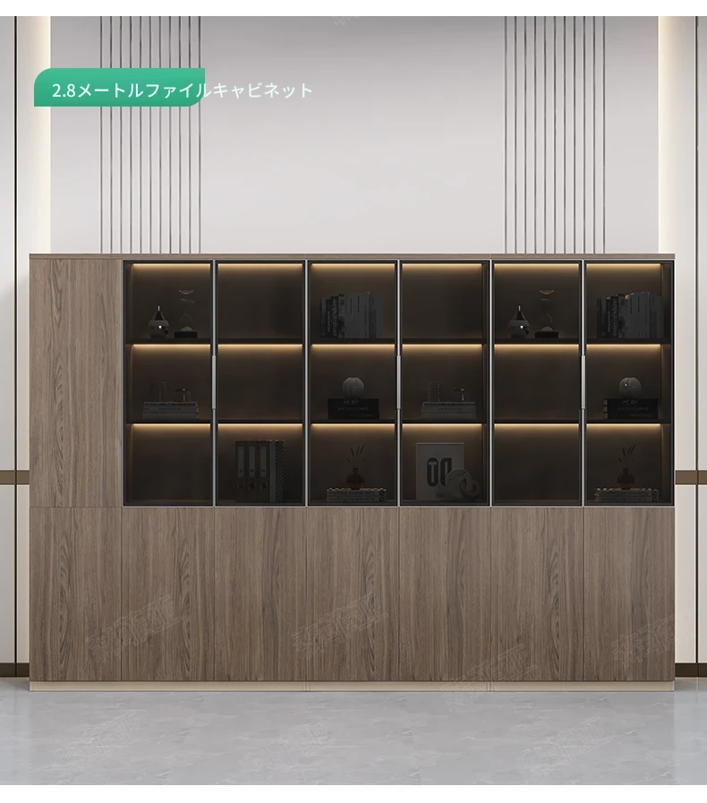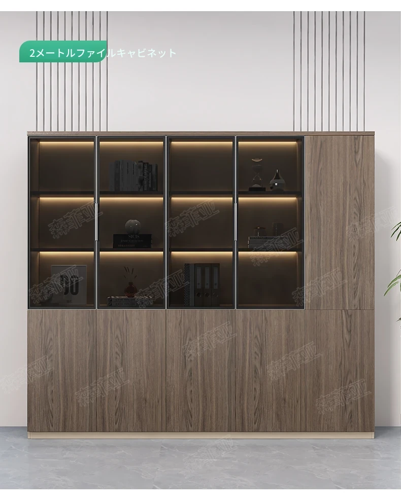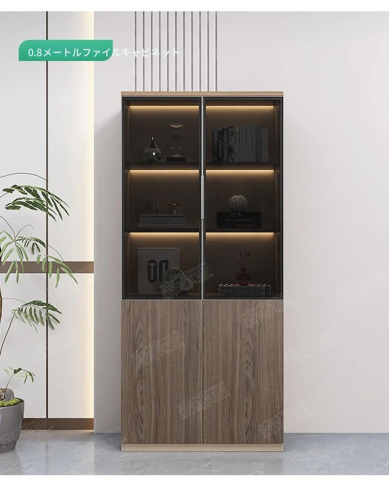 8ドアファイルキャビネット-両側ドアキャビネット(ライト付き)ウッドウォールナット+テクノグレー