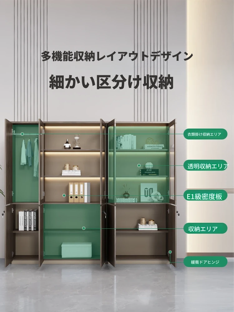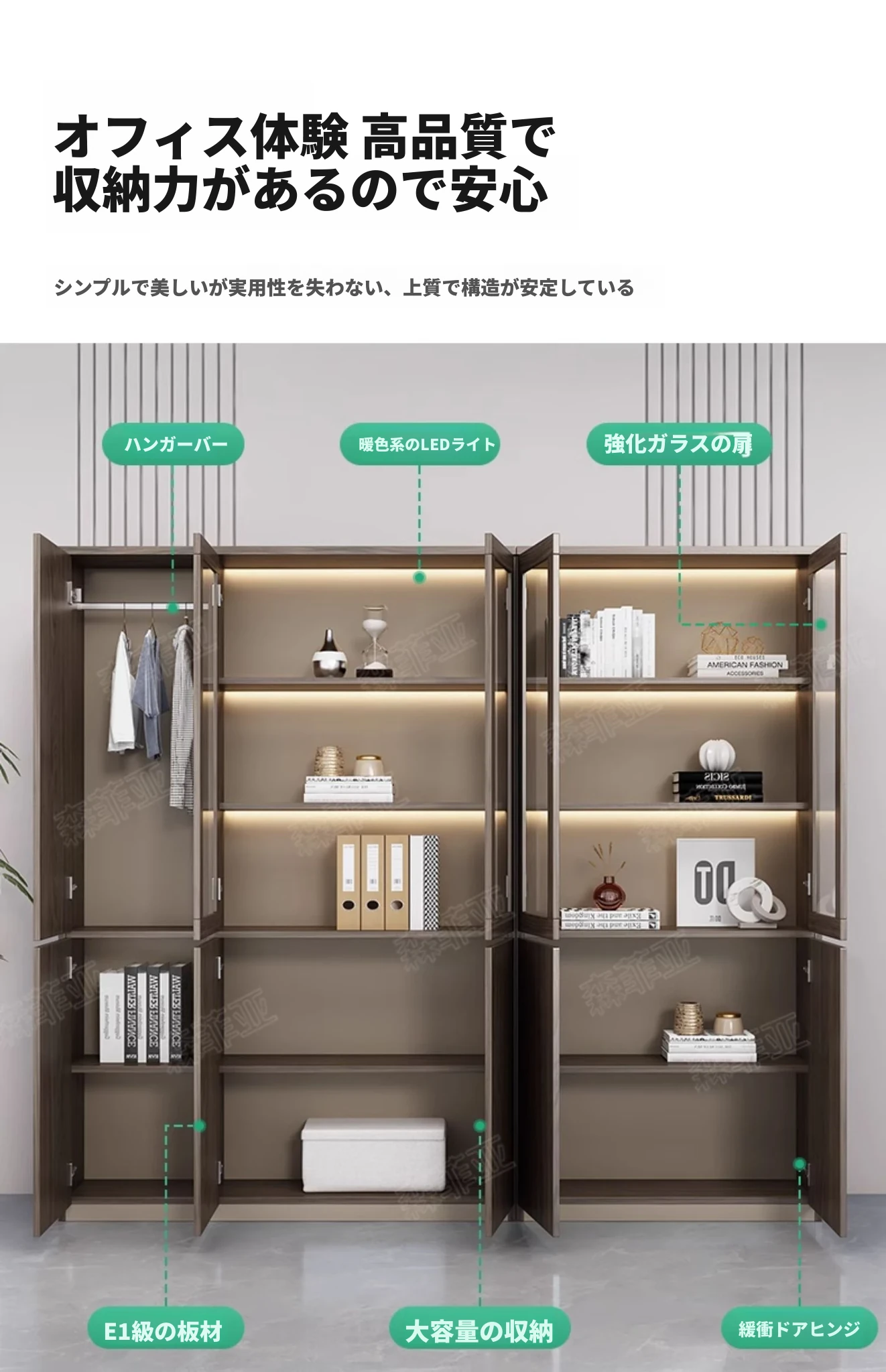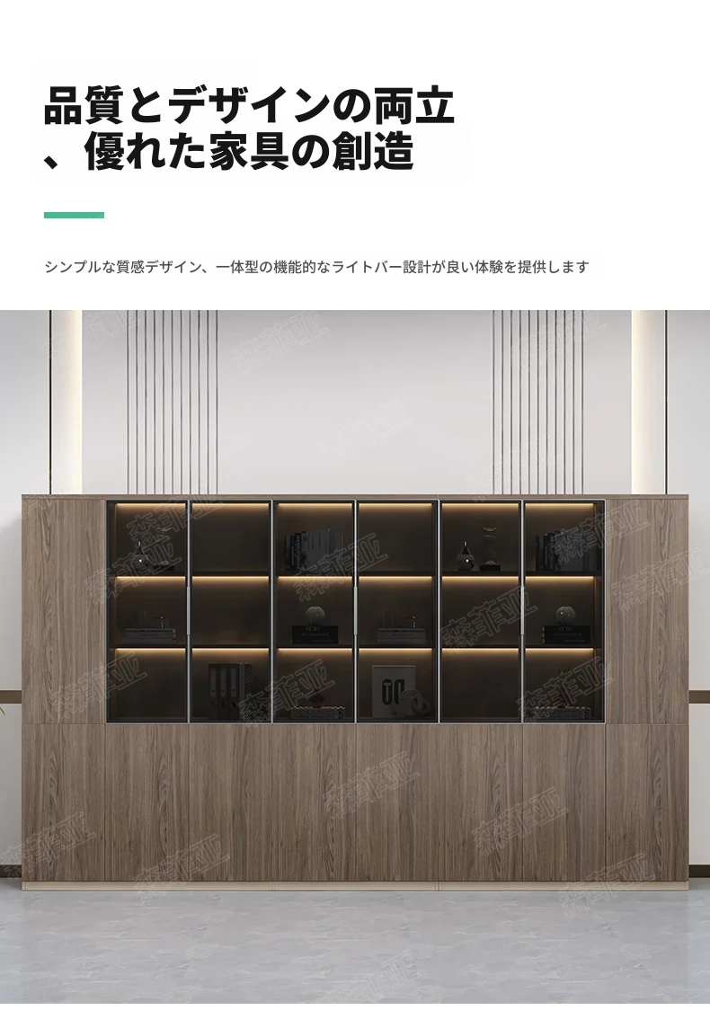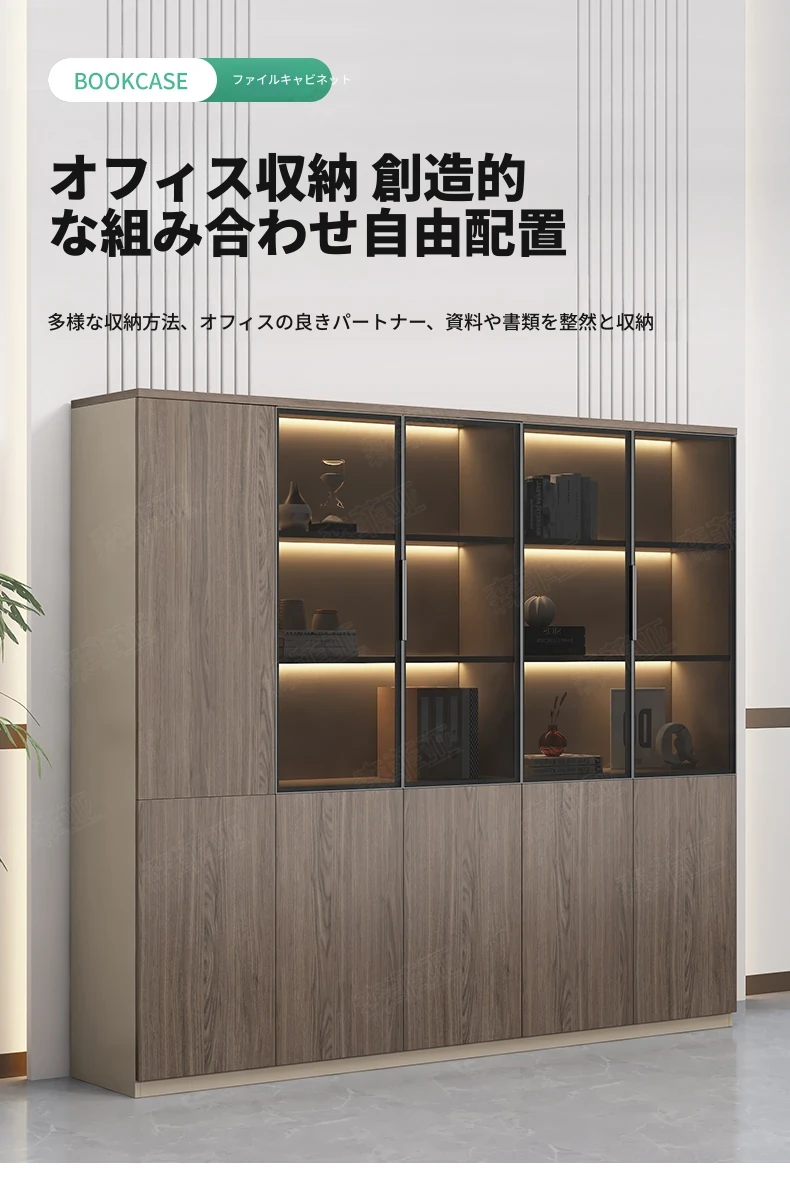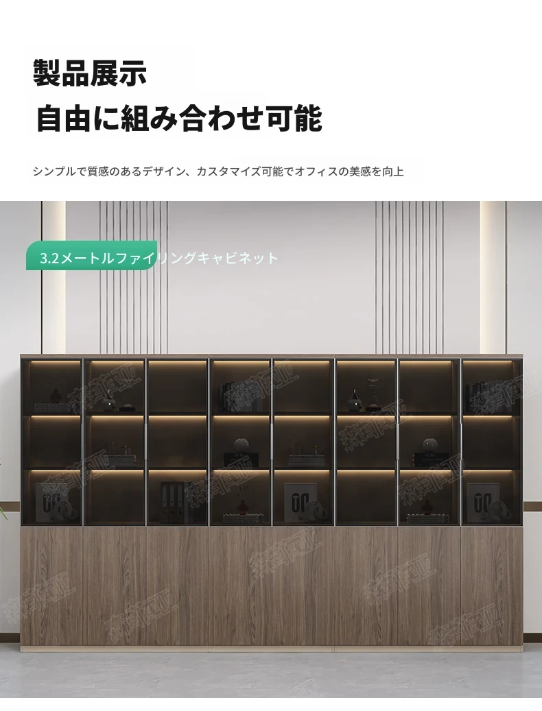 8ドアファイルキャビネット-両側ドアキャビネット(ライト付き)ウッドウォールナット+テクノグレー