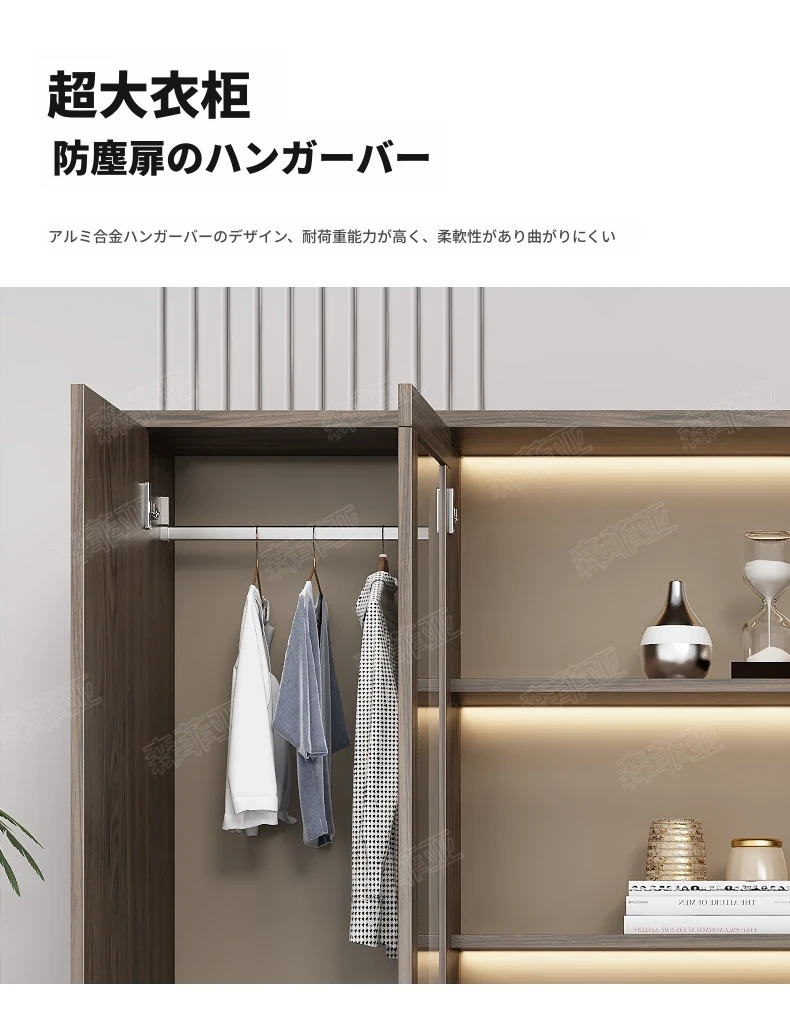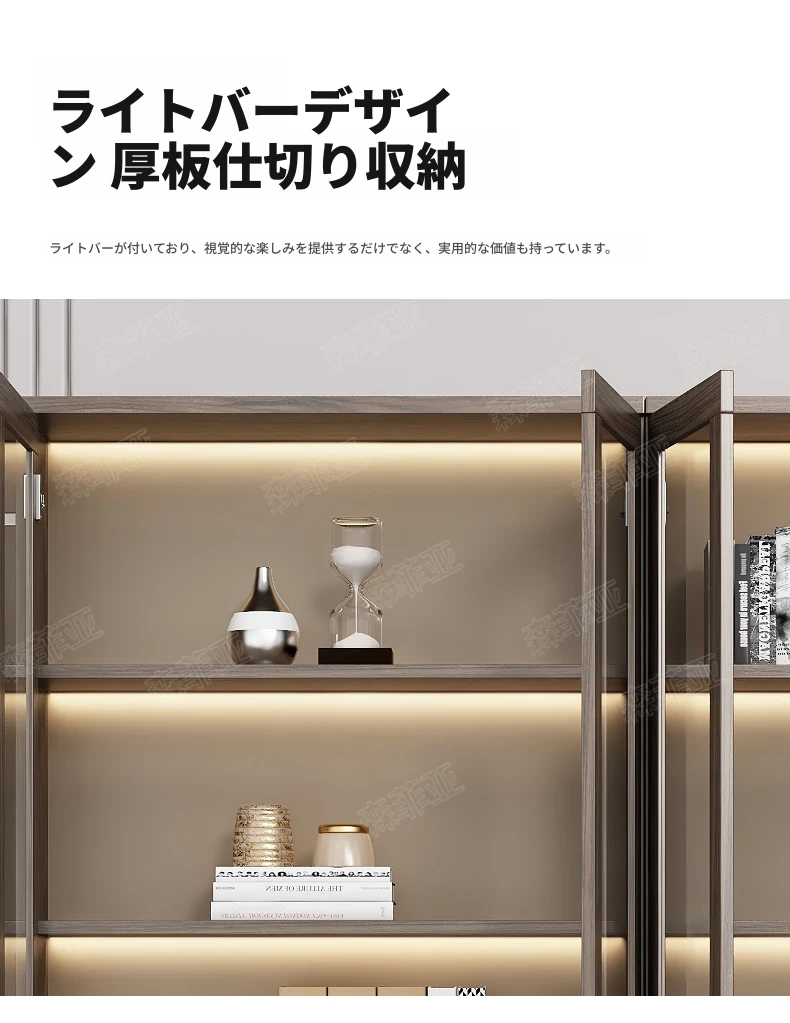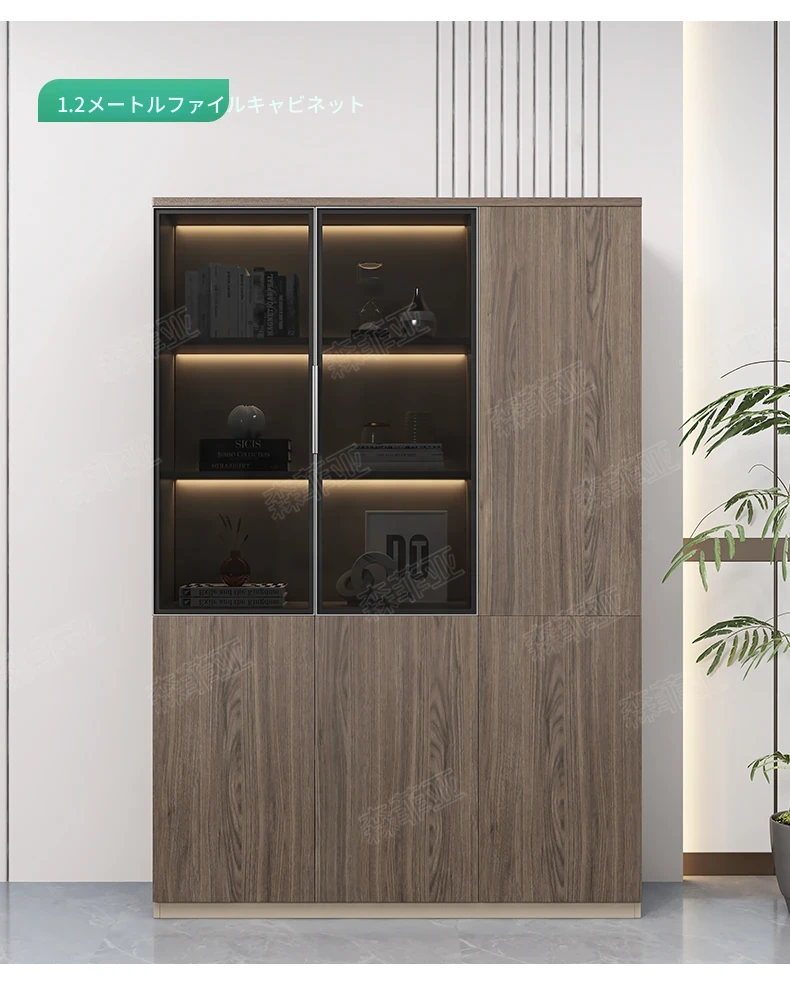 6ドアファイルキャビネット-両側ドアキャビネット(ライト付き)ウッドウォールナット+テクノグレー