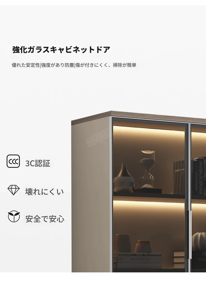 4ドアファイルキャビネット-ガラスドア(ライト付き)ウォームホワイト+アイアングレー