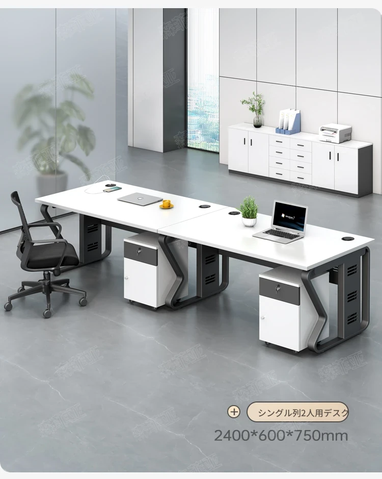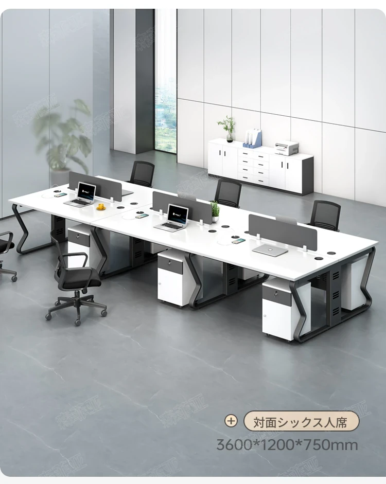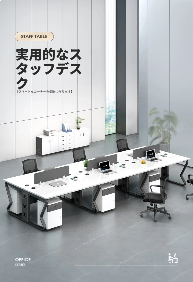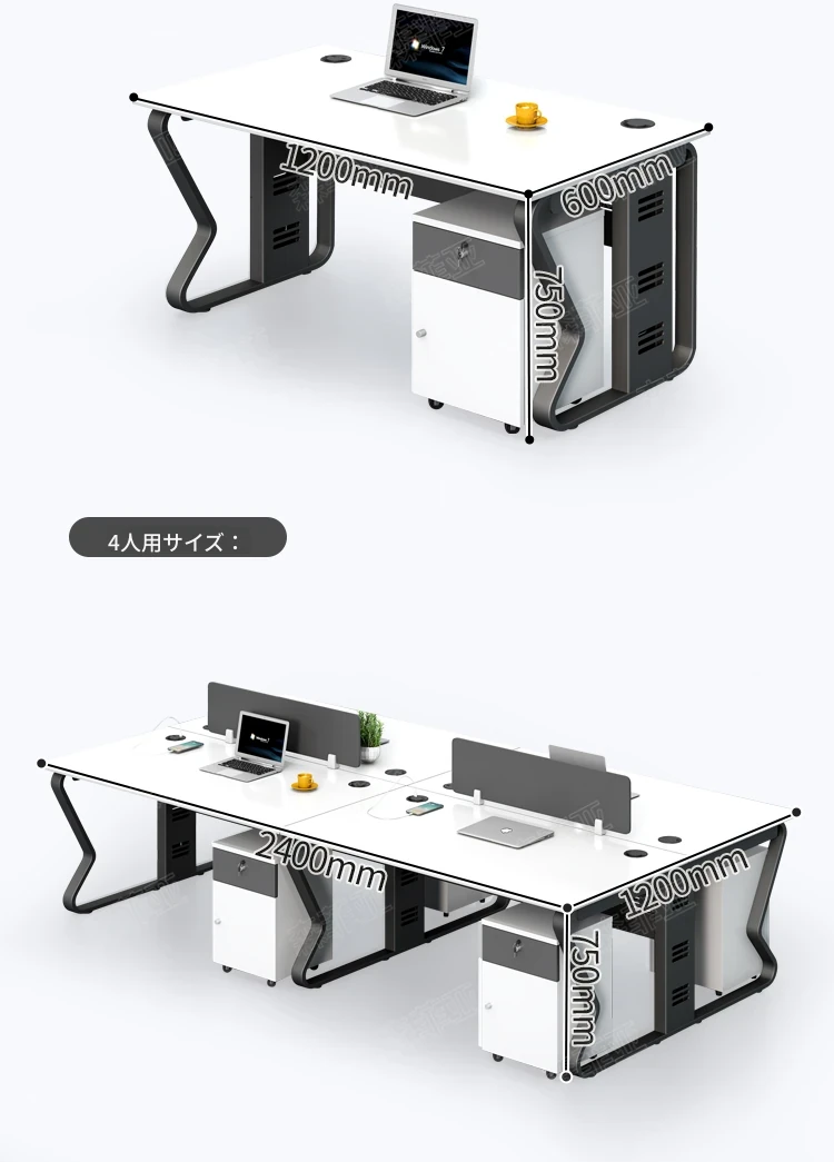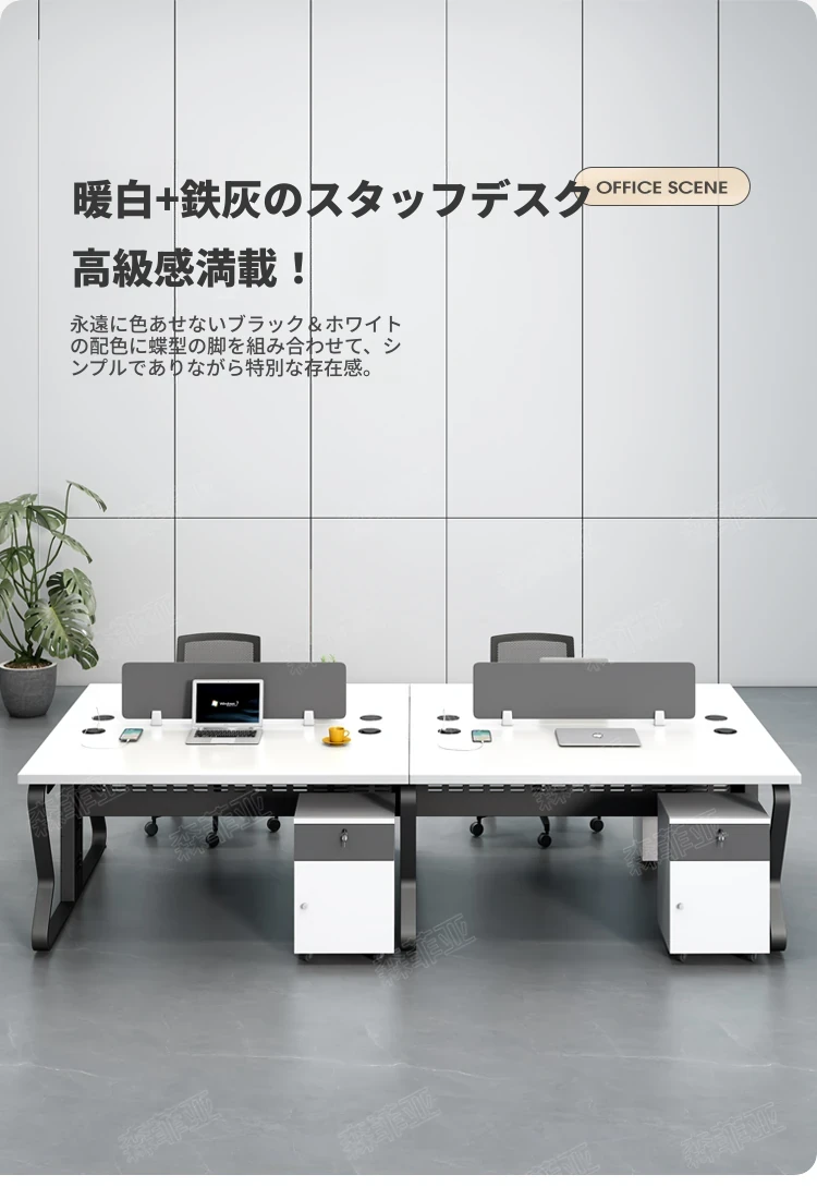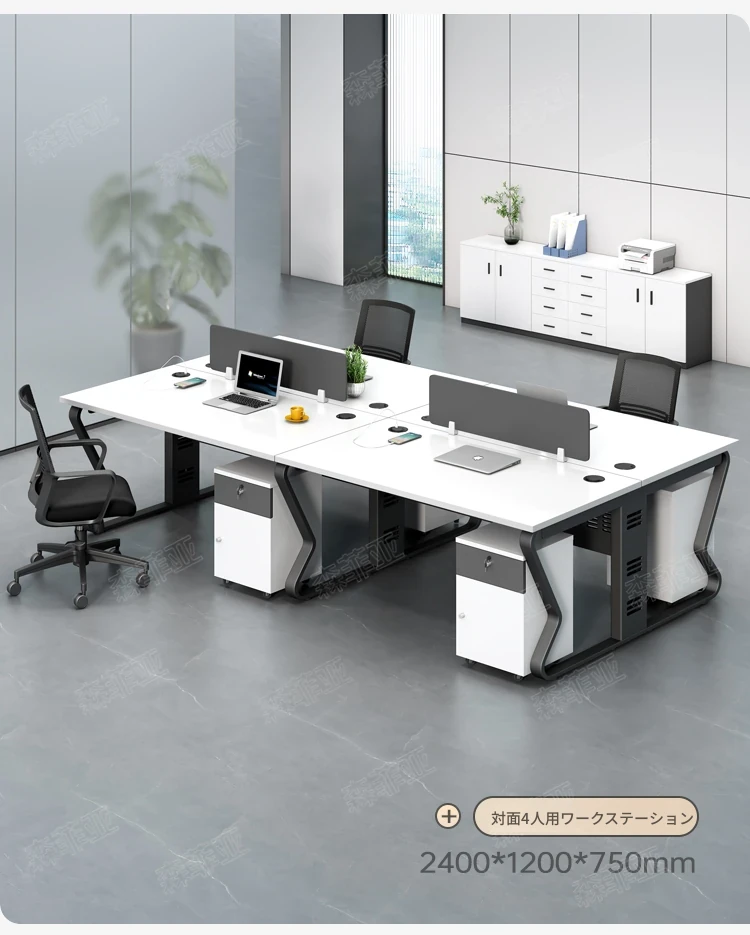 4人用オフィスデスクセット - スタイリッシュなホワイトスチールフレームのデュオデスク。快適な作業環境を提供し、チームの生産性を向上させる理想的なオフィス家具です!