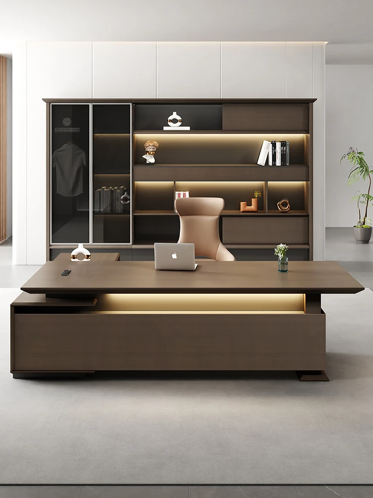 高級感溢れるシンプルなデザインの社長デスク!照明付きで、エグゼクティブやボスに最適なオフィス家具セット。洗練された空間を演出し、ビジネスシーンを格上げします。